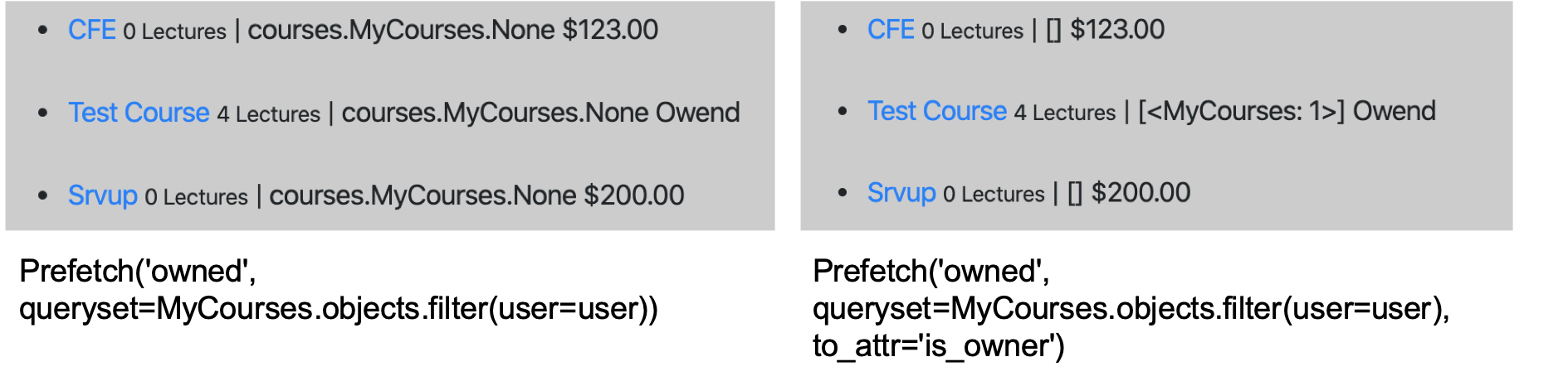 {% for item in object_list%} <li> <a href="{{ item.get_absolute_url }}"> {{ item.title}} </a><small>{{ item.lecture_set.count }} Lectures</small> | <!-- 문제가 되는 부분 --> {% if item in request.user.mycourses.courses.all %} Owend {% else %} {{ item.display_price }} {% endif %}<br><br> </li> {% empty %} <li>No item Found</li> {% endfor %}이러한 문제는 prefetch_related를 이용해 course + mycourse(filtering user)를 한꺼번에 가져와 해결할 수 있다.