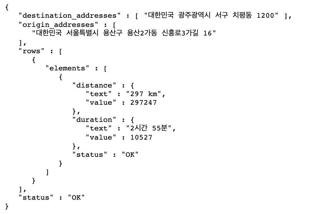 https://maps.googleapis.com/maps/api/distancematrix/json?units=metric&mode=transit&origins=37.541,126.986&destinations=35.1595454,126.8526012®ion=KR&key=[api-key]위 링크를 주소창에 입력하면 아래와 같이 json 타입으로 데이터를 받을 수 있다.
