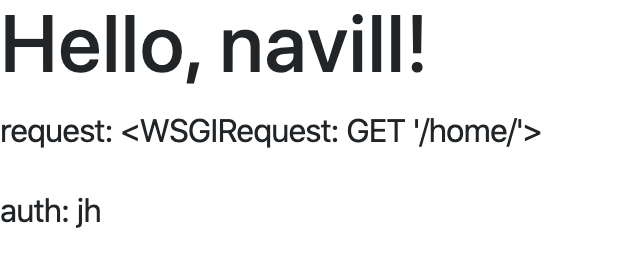 <h1>Hello, {{ name }}!</h1> <p>request: {{ request }}</p> <p>auth: {{ user }}</p>