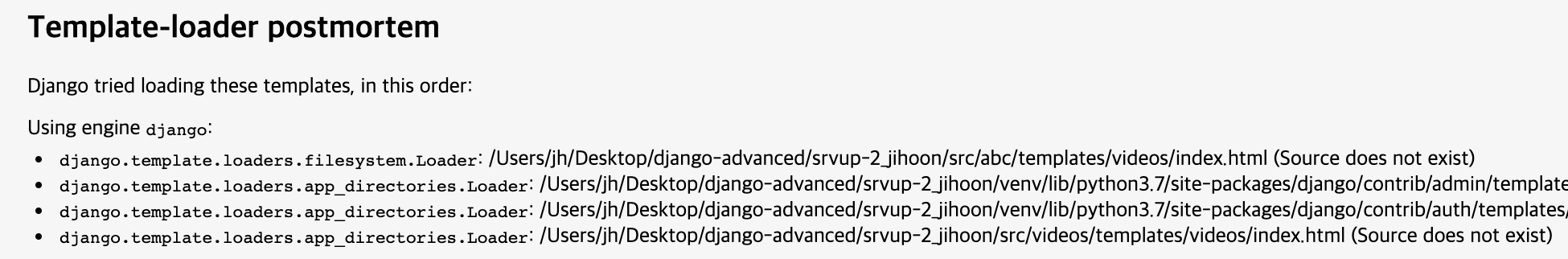 template.loaders는 root directory에 위치한 abc/templates에서 먼저 index.html을 검색하고(첫 번째), videos앱에 있는 template/videos에 index.html을 검색한다(네 번째). -> 찾지 못할 경우 에러 - OPTIONS - context_processors: context_processor.request & auth는 템플릿에서 request와 user에 대한 처리를 가능토록 지원한다.
