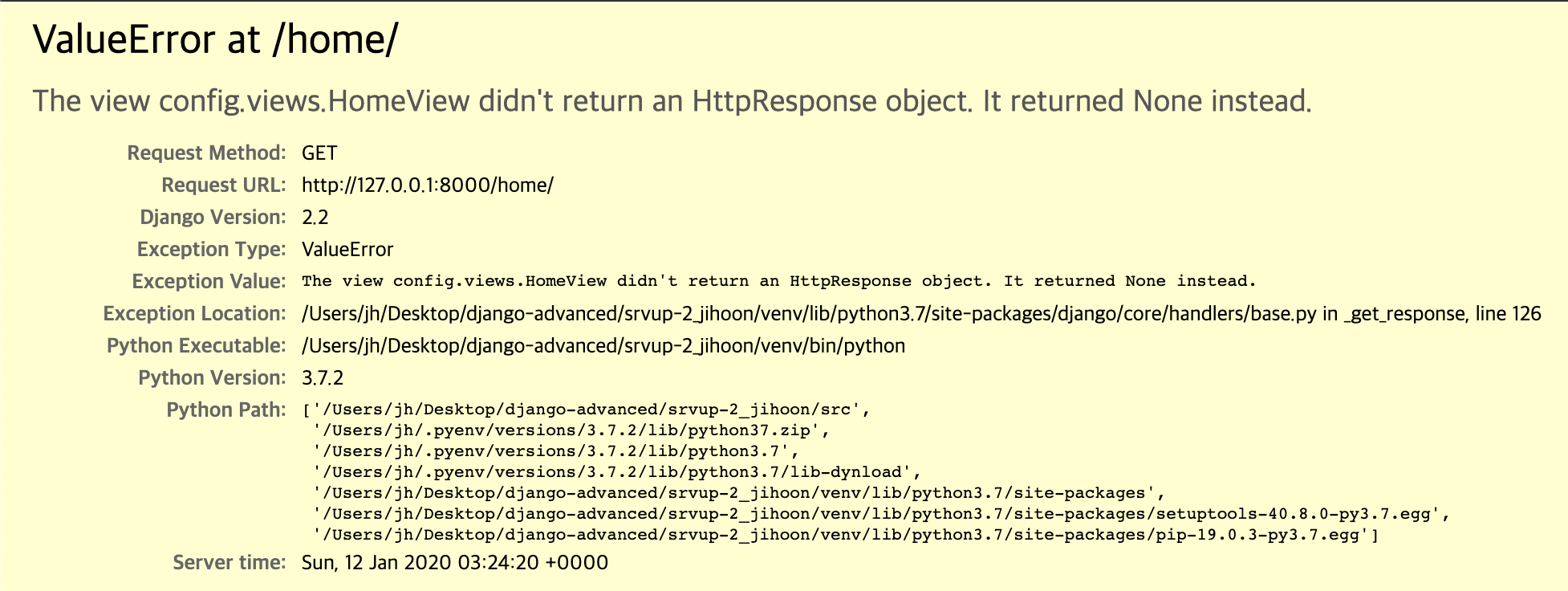 페이지를 표시할 때 HttpResonse 객체를 요구한다. 없을경우 ValueError 발생.